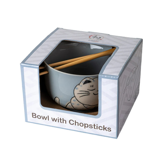 18oz Donburi Bowl With Chopsticks Set Chubby Cat Design Gray