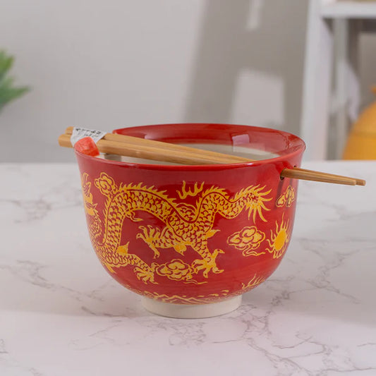 18oz Donburi Bowl With Chopsticks Set Oriental Ryu Design Red